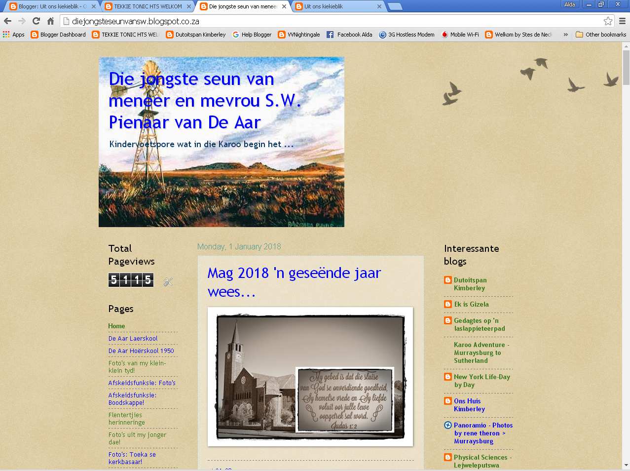 My storietjies en gedagtes teken ek maar op vir die kinders, maar veral vir die kleinkinders, sodat hulle darem so 'n ietsie van hulle oupa en ouma kan lees, as hulle eendag tot ruste kom... deesdae se kinders lewe mos teen dubbelspoed... verder lees hulle mos net dinge wat op internet is... so daarom het ek maar besluit om dit vir hulle makliker te maak... ek beweeg toe op hulle terrein!
